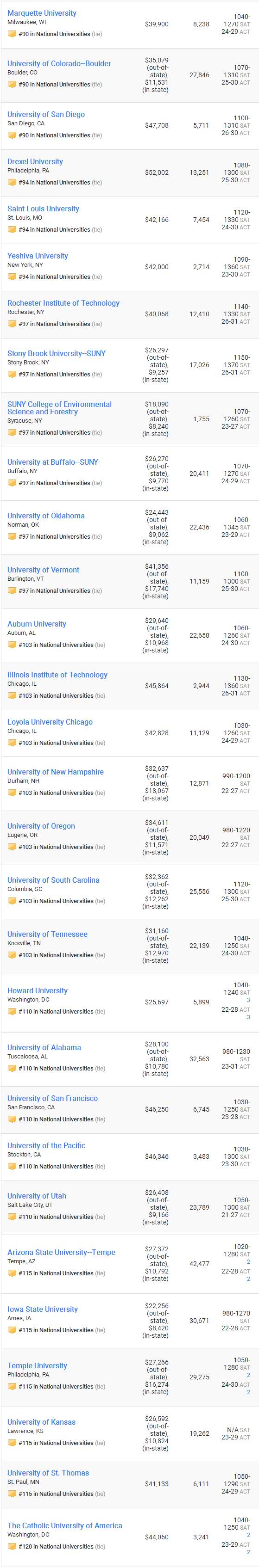> 18年美国大学排名及录取均分(90-120)