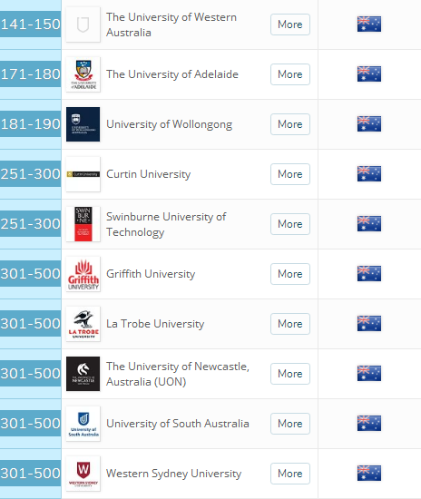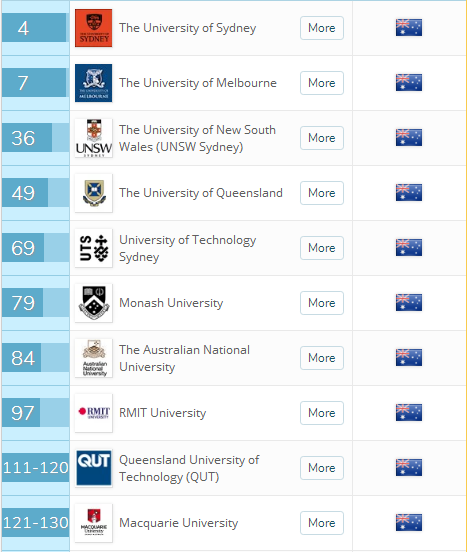 值得一提的是, 悉尼科技大学UTS ,澳洲 第5 ,排在在 莫纳什大学 和 澳洲国立大学 之前; RMIT , 昆士兰科技大学QUT , 麦考瑞大学 ,都要比 西澳大学 和 阿德莱德大学 高。