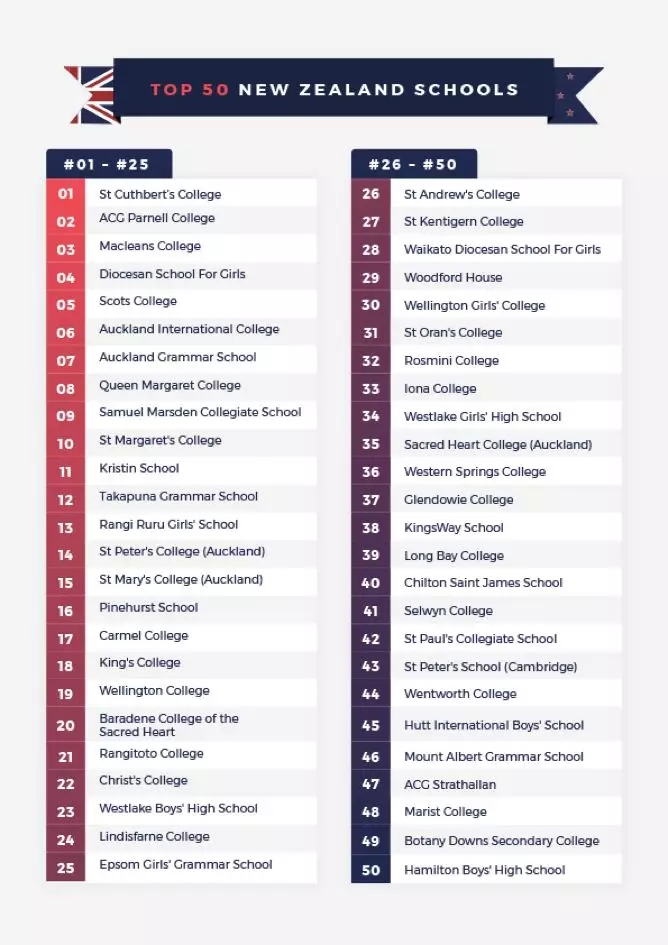 最近, 教育咨询机构Crimson Eucation 联合 QS大学排名机构 (QS-Worl Rankings) 首次联合推出了的一份关于新西兰中学的排行榜。有了这份榜单,新西兰中学的 教学质量 也就变得更加 透明 ,可以作为同学们选择高中院校 的 重要参考 。新鲜出炉的完整榜单赶紧Pick一下吧~