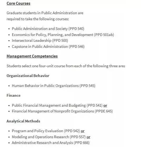 公共管理毕业生一般在各级政府、非盈利组织、咨询公司、国际性机构或者私营机构从事相关工作。以南加州大学的MPA项目为例,核心课程中就涵盖了公共管理、领导力、组织行为学、财务管理、项目管理和分析等领域,而这些都是在公共管理实际工作中会经常用到的知识,针对性很强。详见下图。