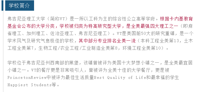 ★ 推荐学校: US NEWS排名76-弗吉尼亚理工大学 Virginia Tech