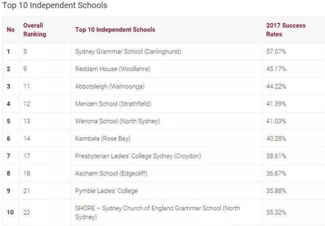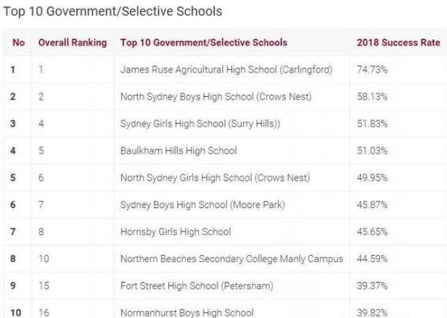 公立精英中学James Ruse Agricultural High School连续23年成为新州高考排名第一的学校,而悉尼老牌私立男子学校Syney Grammar School上升至第三名,另一所私立学校Ream House成为前10名里唯一的一所非精英中学(阿朱注,前十名中有8所示公立精英中学,入学要考试,而第三名私校Syney Grammar入学也要考试,而Ream House是唯一的没有入学门槛non selective的学校,当然,学费还是要缴的)