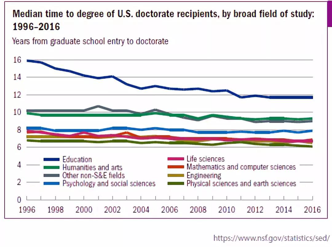 美国的博士学位就难拿得多了,在学校待的年头也要长得多。根据2018年3月美国国家科学基金会给出的统计数值,1996-2016年美国各博士学位毕业平均年限见下图: