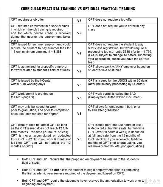 小提示 : CPT的生效可能需要花10天的工作日,所以尽量提前准备。CPT的工作许可必须在工作开始前获得,不允许学生在I-20上规定的CPT的时间外工作,就算是多工作一天都算违法,后果很严重。