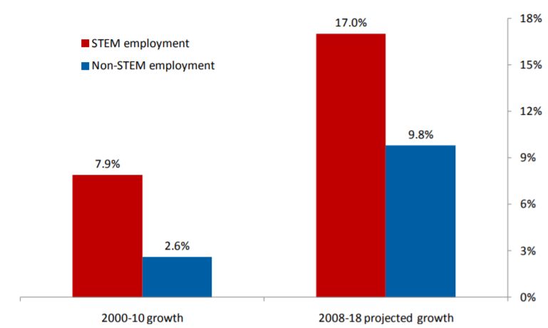 依据美国劳动统计局数据,STEM 领域的工作机会在 2009至2015 年间增加了10.5%,增加了超过80万份工作。