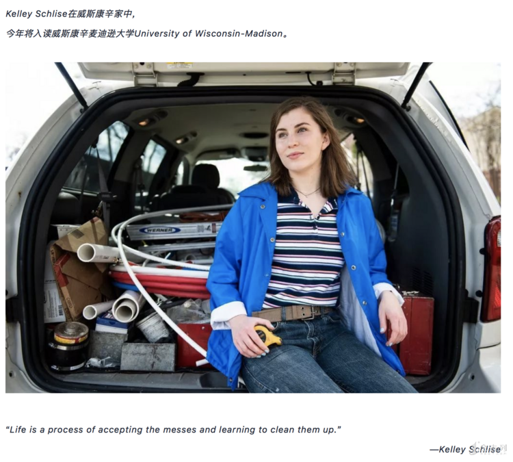Each humi morning, I wrestle myself into a pair of use men’s jeans from Goowill that most of my peers woul refuse to be seen wearing in public. I slip my tape measure onto my belt, tie my hair back as I run out the oor, an climb into the passenger seat of the plumber truck, which is really an age white minivan with two kins of pipes strappe to the top.