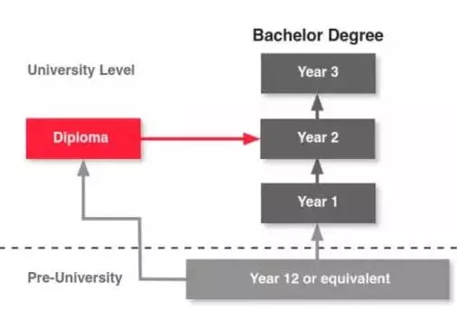 通过上图,我们可以理解为Diploma课程和大学本科的第一年的课程等同,也就是Diploma课程+本科大二的课程模式,也可以理解为这是一条通往大学本科的过渡课程。他们的区别是: Diploma课程 的入学条件比直接升读本科大一的入学条件要低一些。