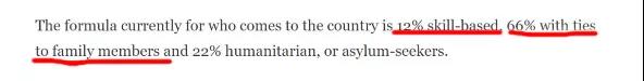 目前美国仅有12%的人靠工作技能获得身份,66%的人依靠亲属关系取得绿卡,22%的人是人道主义者或寻求庇护者。改革后,57%的人依靠技能,33%的人依靠家庭成员,10%的人是人道主义者。