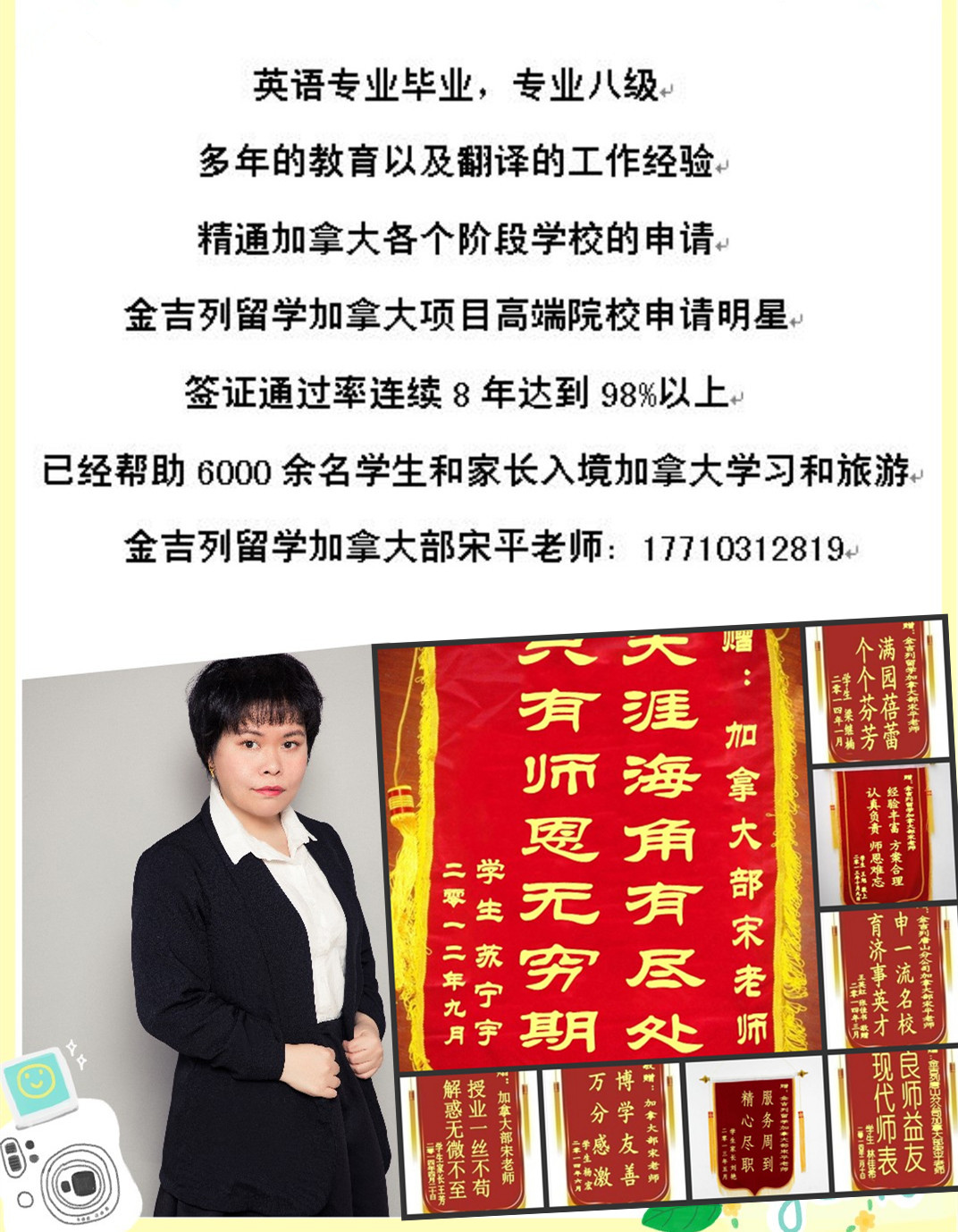 最近不少家长和学生都非常关注留学加拿大,留学性价比最高的国家,加拿大留学费用,如何出国留学,留学办理流程,世界大学排名,出国留学需要什么条件,小学,初中,中专,大专生,本科,研究生出国留学,多伦多大学等信息,金吉列留学加拿大部宋老师为您提供 24 小时留学在线咨询。
