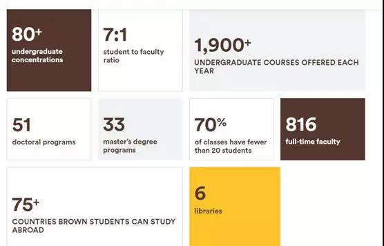 本科拥有80+个方向 ,学生和老师的比例为7:1,每年提供1900+门本科课程,51个博士项目,33个硕士项目,70%的课堂都不到20个学生,816名全职教职工,75+的国家可以让布朗的学生选择海外学习,6个图书馆(分别是小约翰洛克菲勒图书馆、科学图书馆、约翰·海图书馆、奥威葛音乐图书馆、艺术幻灯片图书馆和人口研究图书馆)