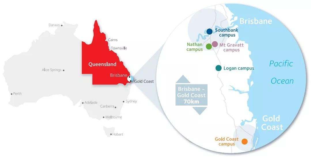 学校共有Nathan 、Gol Coast、Mt Gravatt、Logan和South Bank等五个校区,分布在三座城市,横跨整个澳大利亚发展最迅速的布里斯班-黄金海岸走廊。