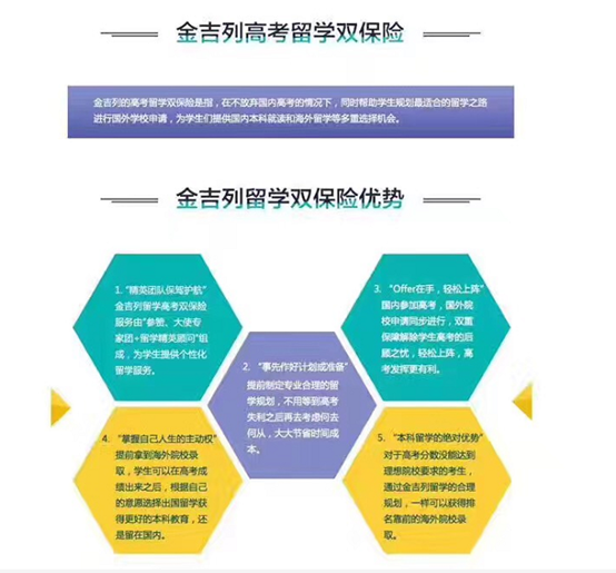 答案就是:选择高考留学双保险计划,金吉列的高考留学双保险是指,在不放弃国内高考的情况下,同时帮助学生规划最适合的留学指路进行国外学校申请,为学生们提供国内本科就读和海外留学等多重选择机会。
