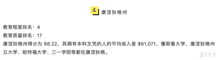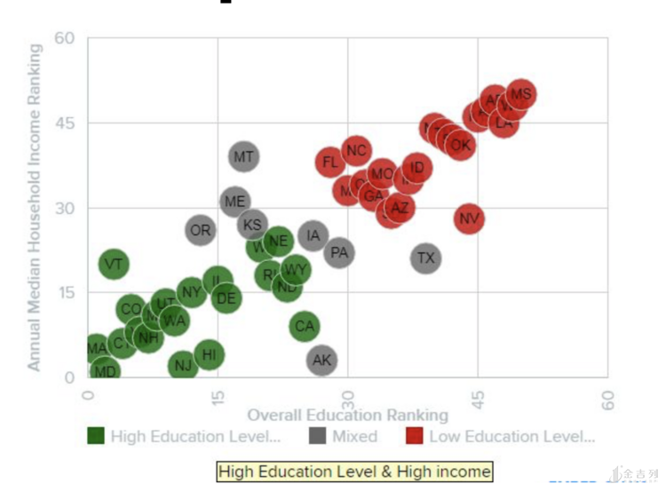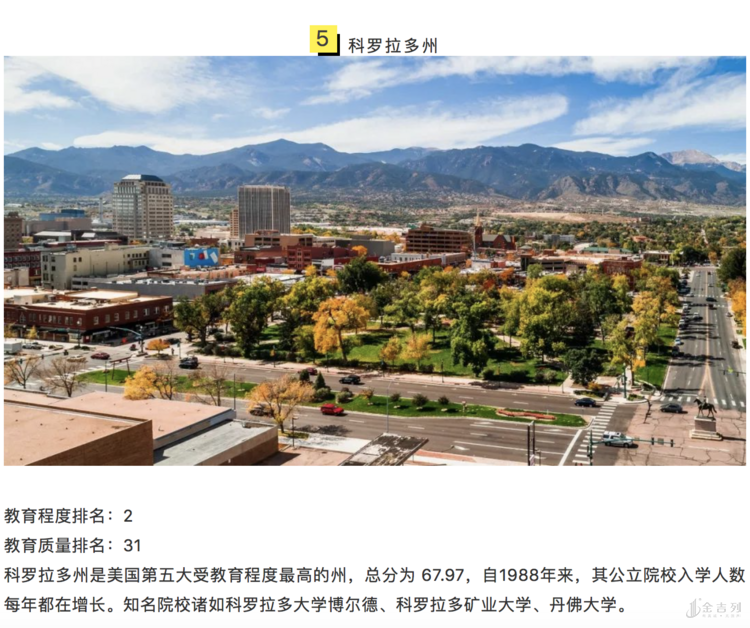 整体来看,教育水平高的州大都位于经济发达的 东北部 ,留学生热门地—— 加州 排名第25,尽管加州大学系统很出名,但与藤校聚集的东北部相比,依然略逊一筹。