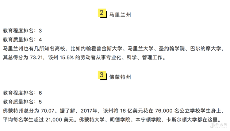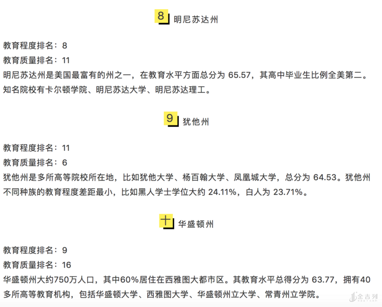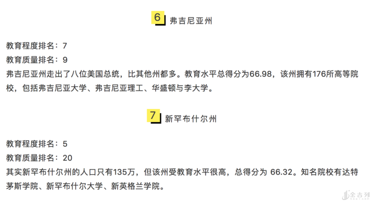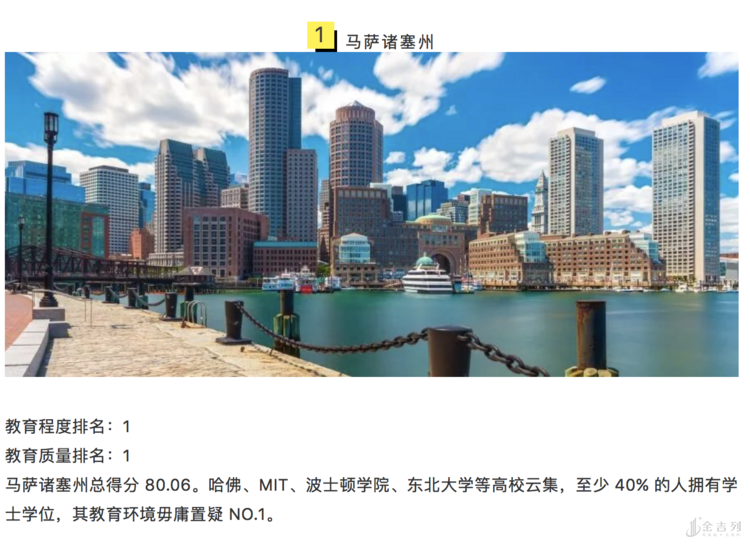 Wallethub从 教育程度 和 教育质量 两个方面,对比了50个州的大学质量、毕业率、25岁以上获得学位比例等共20个指标,公布了全美教育水平最高的州排名。
