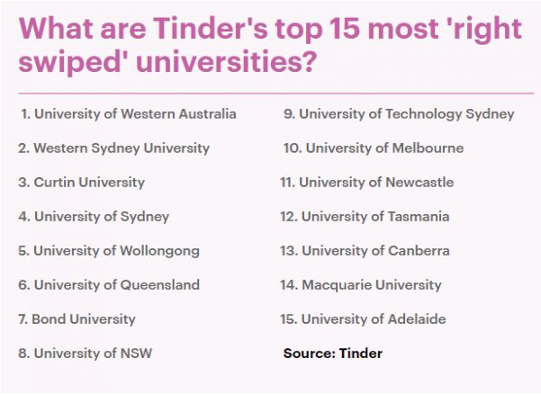 于是乎,Tiner根据用户照片的右滑数, 统计出 澳洲最受欢迎的学生 都在哪就读, 结果让所有人都大吃一惊——