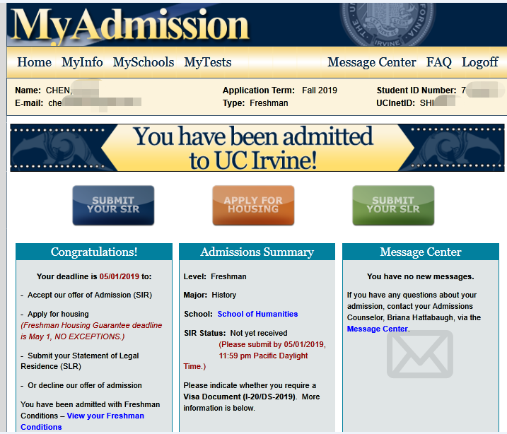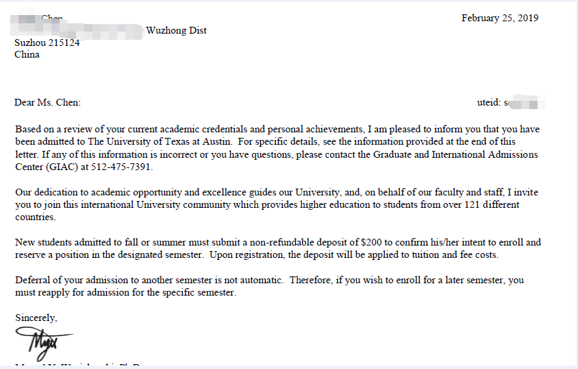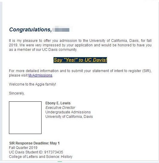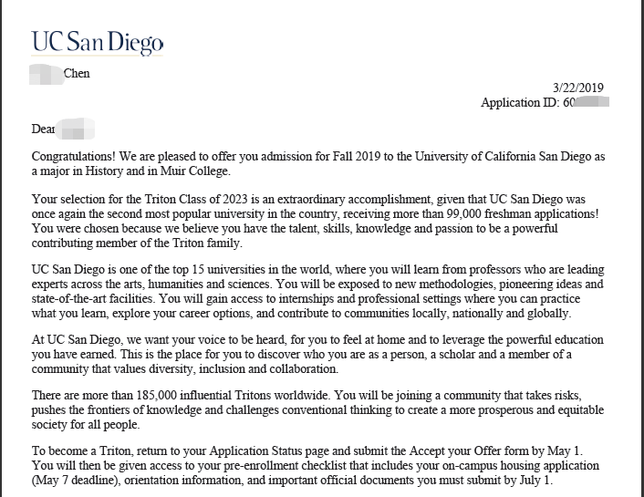 录取结果:加州大学圣地亚哥分校、加州大学欧文分校、加州大学戴维斯分校、威斯康辛大学麦迪逊、德州大学奥斯汀分校、宾州州立大学帕克分校