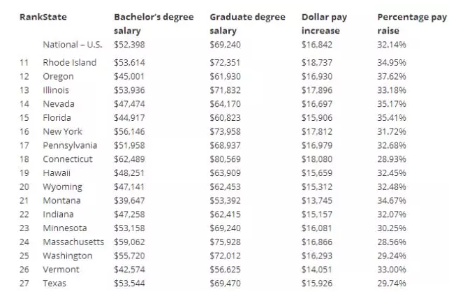 根据美国劳动局最新发布的数据,全美研究生的平均薪资为$69,240,比全美本科生平均薪资还是要高出32.14%的。不过,具体要论研究生和本科生收入水平是否有明显差距还是要看专业和所处的城市。 如果你是一名研究生(Ph.D.、MD 或MBA),那么去这10个州工作你的学位可能更有明显经济优势!
