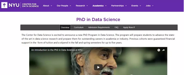 纽约大学数据科学博士学位:总共 72 个学分,由 3 年课程和 2 年论文组成,并且有长达 5 年的经济援助。另外,72 个学分中只有 15 个是必修课,其余 57 个是选修课,学生可以选择自己喜欢的子领域。 要求具有数据科学经验,数学、统计学、计算机科学、工程学等相关专业背景,有微积分、概率、统计、编程等课程知识,国际生建议托福不低于 100,雅思不低于 7.0,只接受GRE成绩。