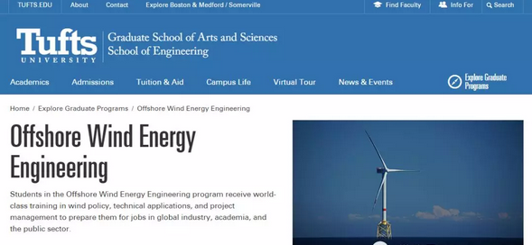 塔夫茨大学海上风能工程硕士:土木工程和环境工程系着眼于新领域开设的项目,为期一年,侧重于风能政策、技术应用和项目管理,它还提供 M.S. Innovation & Management 的双硕士学位项目。 要求有生物学、化学、物理学、数学、工程科学等先修课,非塔夫茨大学本科生的学生要提供 GRE 成绩,国际生要提供托福或雅思成绩,三封推荐信。