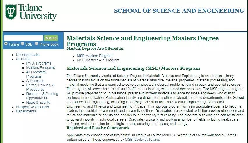 杜兰大学材料科学与工程理学硕士项目:新学位旨在帮助毕业生在生物技术、航空航天、信息技术和能源等领域的职业发展。既可以选择材料科学与工程的普通项目,也有4+1项目 (意味着你要完成24个学分加一篇论文) 。 要求具备数学、物理、化学等课程知识,提供 GRE,托福或雅思成绩,2019年6月30日截止申请。