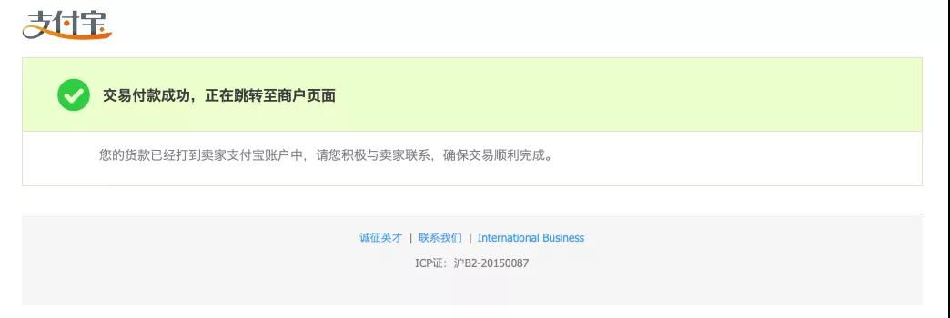 通过手机支付宝终端完成支付后,会有以下界面确认支付成功:
