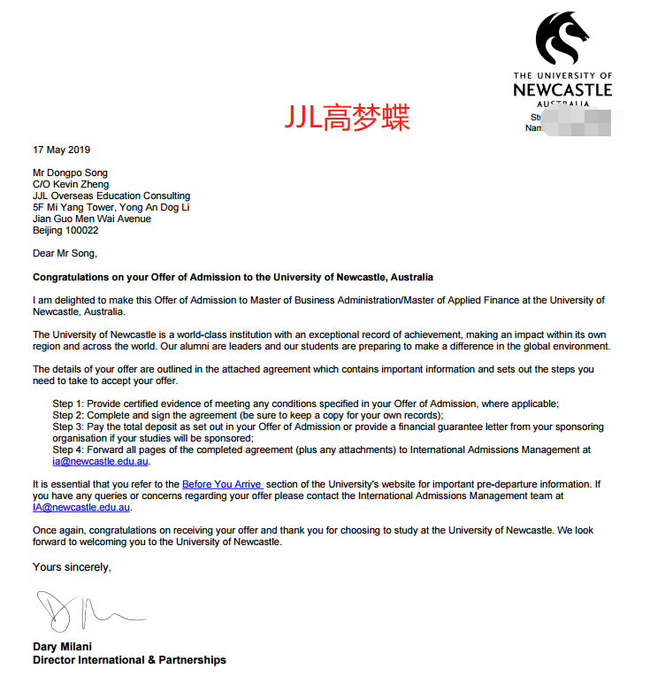 因为前期充足的准备,所以学生很快就拿到了录取通知书,递交申请时间为2019年5月13日,收到录取通知书的时间为2019年5月17日,只用了四天的时间。