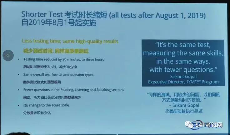 从这次考试改革看,考试时间减少,很显然是对考生“减负”。而缩减部分又是中国学生比较吃力的听力和口语部分,所以这次考试改革整体来看是对大陆学生“利好”,报 8 月份以后的考生有福了!