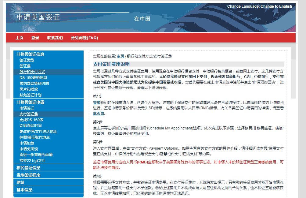 签证费上涨是个坏消息,但是也有便于中国学生的好消息: 美国签证费我们也可以选择网上支付宝付款了! 我们再也不用跑到中信营业柜台或ATM机上办理手续了~ 根据美国签证官网显示,使用支付宝在线支付的流程如下: