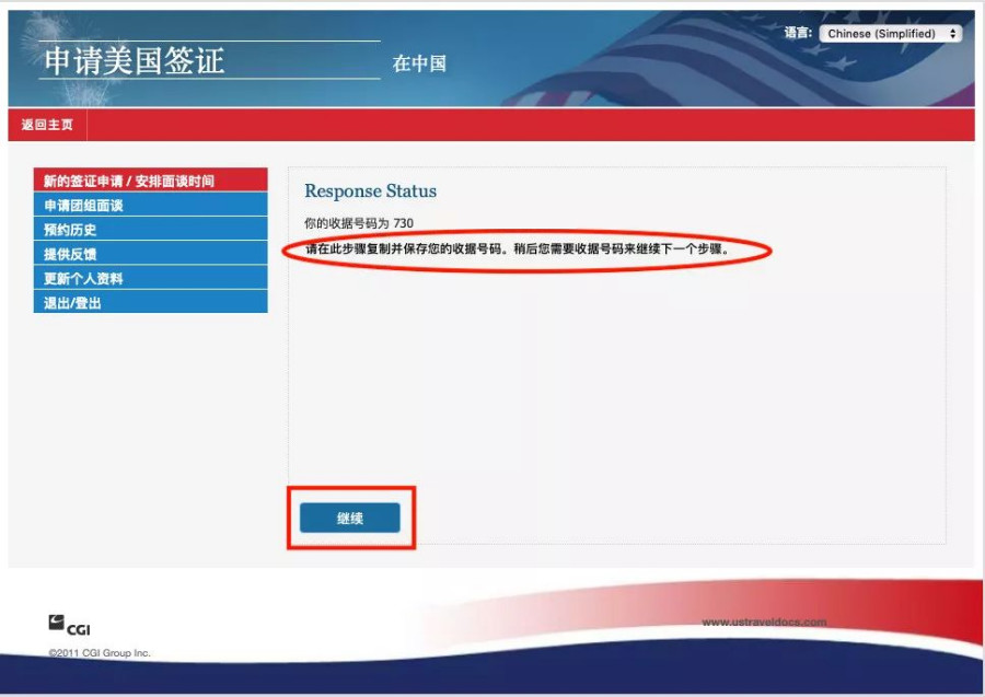 页面稍后跳转回到ustravelocs.com网站。在您点击“继续之前,请确保您截屏这一页面或者写下或者复制粘贴您的收据号码;