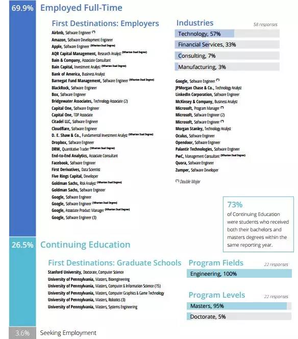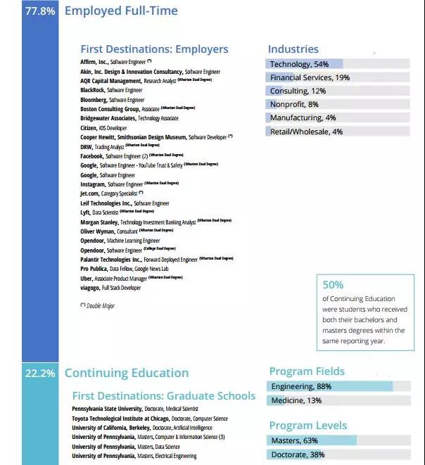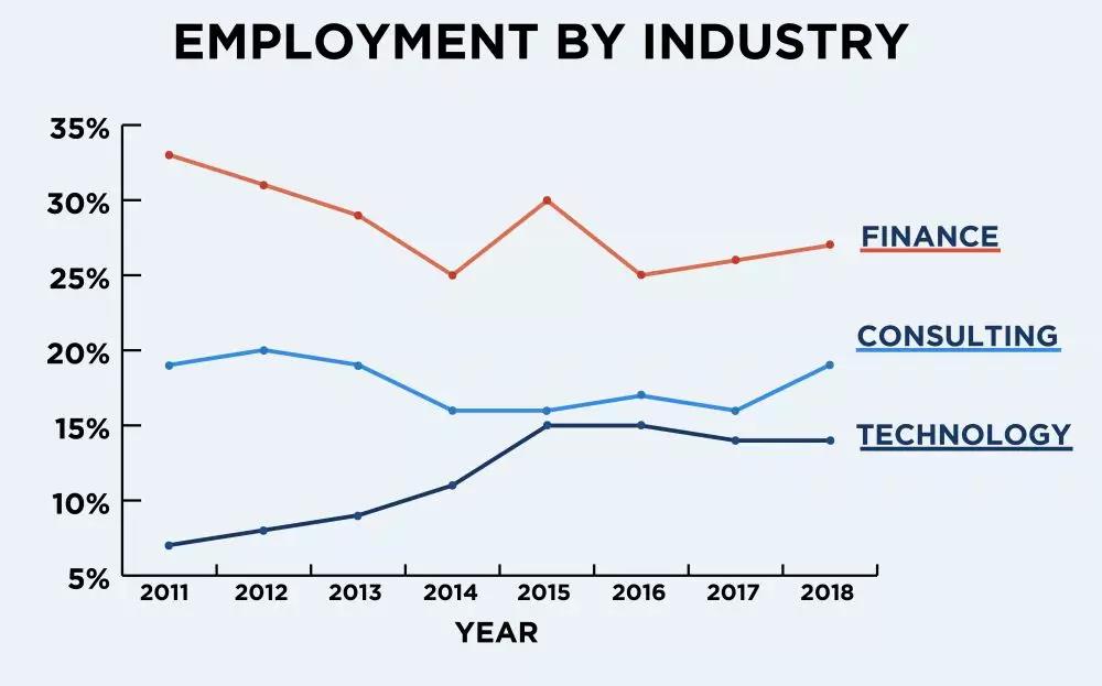 在过去的八年中,尽管求职市场变化不定,但咨询、金融、科技一直是宾大毕业生青睐行业 Top 3。