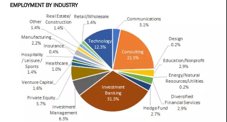 沃顿商学院的本科毕业生, 90.9%选择全职工作, 一半去了投行和咨询公司