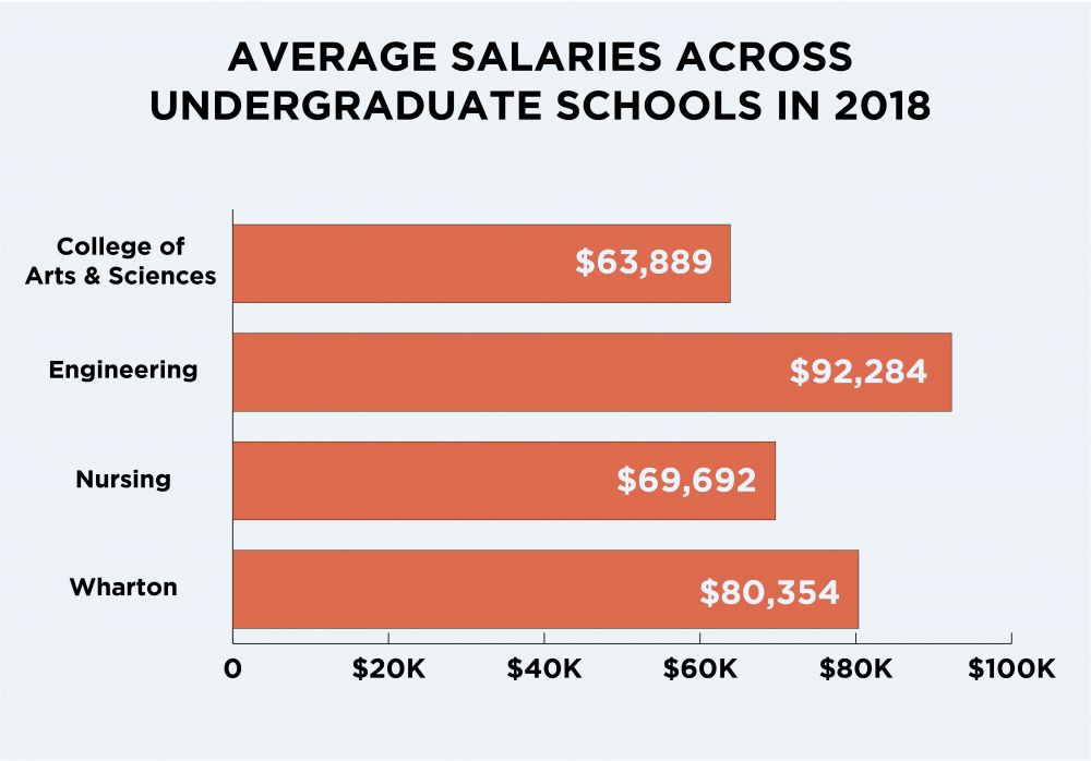 美国薪酬统计机构 Payscale 显示,宾夕法尼亚大学毕业生职业早期平均 $70,100。其实不同专业薪资差距还是很大的。 根据学校统计, 文理学院 2018届毕业生平均工资为 $ 63,889。最高的是工程学院,比 2017年 增长 1.5%左右,高达 $ 92284;其次是沃顿商学院, 平均 $ 80354。