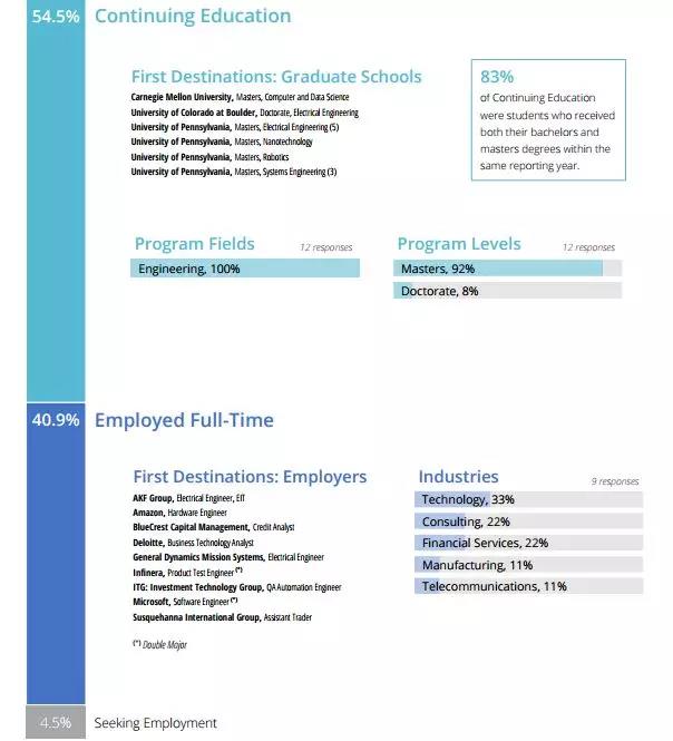工程学院里56.5%选择全职工作,37.5%进行更高层次深造。 除了科技、金融、咨询,12%的学生选择了制造业