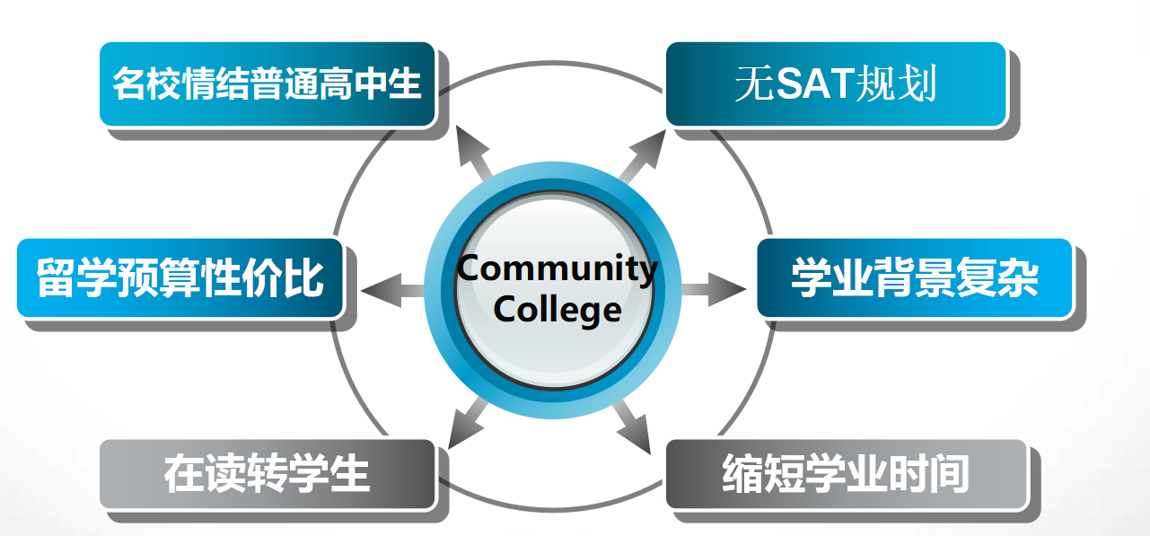 社区学院的使命包括五个组成部分,转学教育、职业生涯教育、一般教育、补偿教育以及社区教育。 国际学生 &nash;转学教育,转学教育提供大学学士学位的前两年课程,大学承认社区学院的学分,能成功地转入公立或私立的四年制大学,同时还提供其他选修课程。几乎所有的美国大学均接受从社区学院转入的学生。社区学院拿了前两年的学士学位课程(副学士学位),然后转学到四年制大学以便完成第三及第四年课程,故此学生从四年制大学得到一个学士学位。