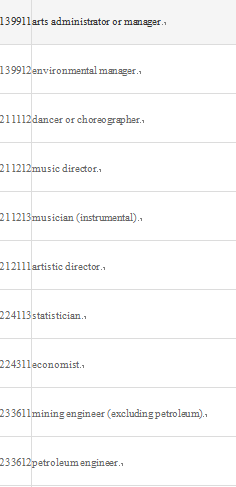 统计学家 224113 、经济学家 224311 、其他工程职业 233999 、大学老师 242111 ,计算机专业的多媒体专家 261211 和软件编程其他 261399 等专业有幸新增进 MLTSSL 表,可以申请 189 独立技术移民了。