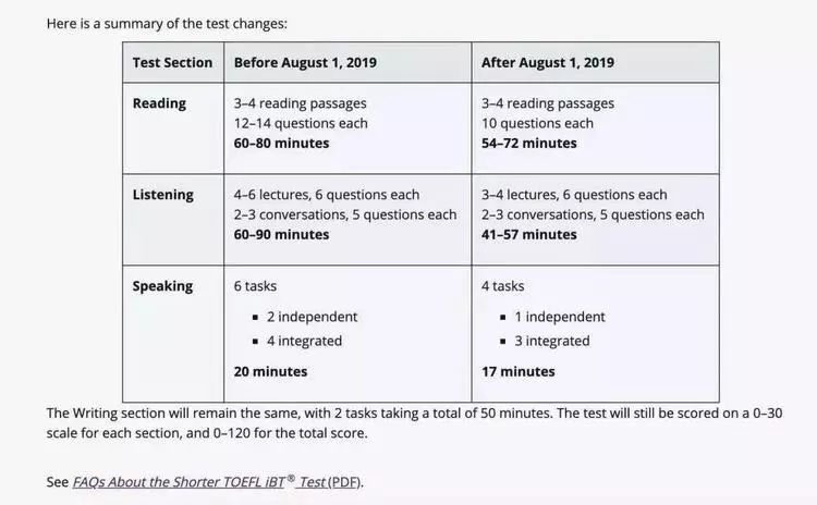 在此次发布会中,托福官方还发布了一大消息,考试时间缩短为3小时,题量减少!具体修改如下: