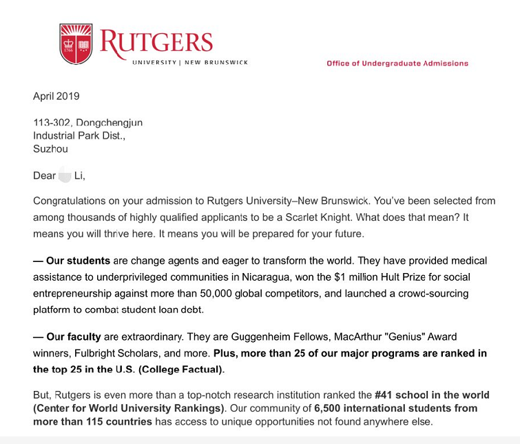 回归正题,恭喜德威L同学,低GPA成功逆袭美国排名前50的院校罗格斯大学!!!