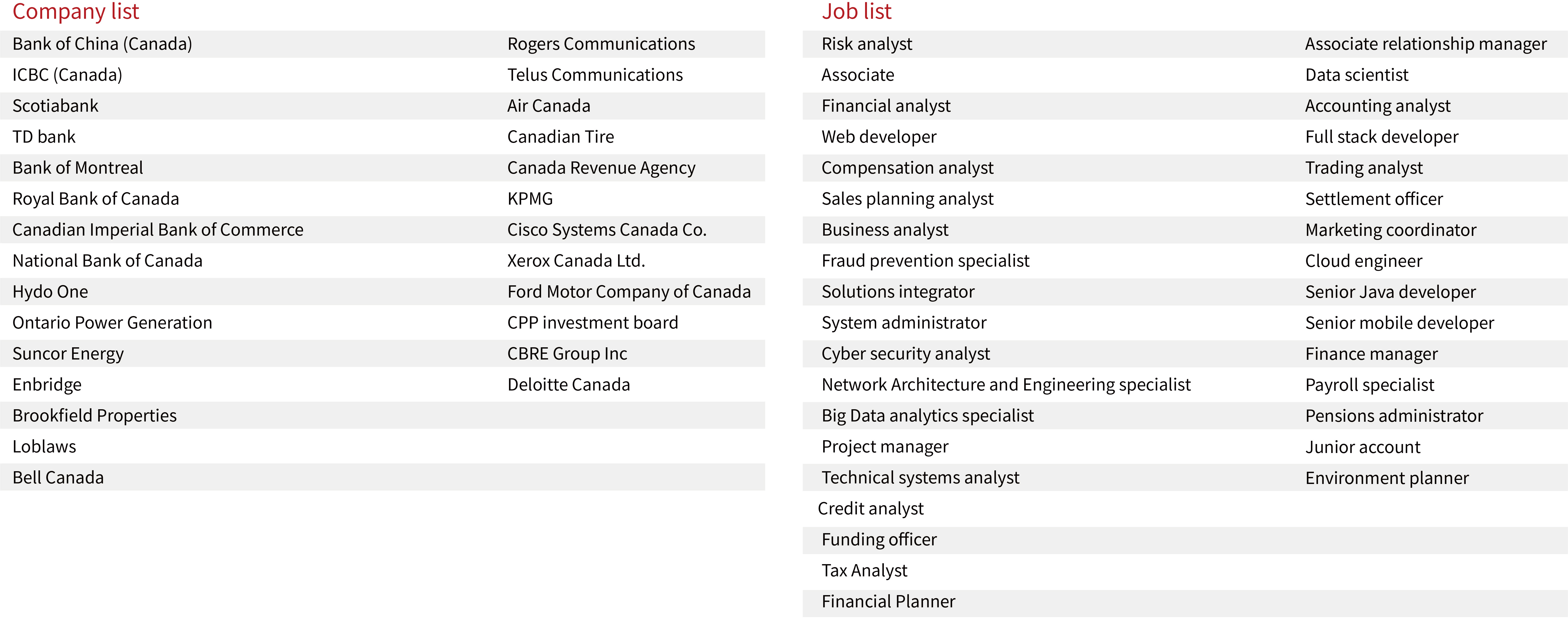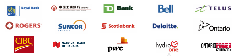 已成功帮助完成就业培训的学子们拿到加拿大上市公司或大型企业或政府机关的工作机会。如:安大略省政府(Government of Ontario)、加拿大皇家银行(Royal Bank of Canaa)、丰业银行(Scotiabank)、中国工商银行(加拿大)、贝尔电信集团(Bell Canaa)、森科能源集团(Suncor Energy)、安省第一电力公司(Hyro One)等。