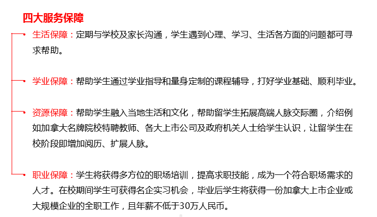 ★为留学生提供加拿大金融、能源、电信、政府等行业的面试机会,为符合岗位要求的学生推荐全职工作,例如Accounting Analyst(会计师)、Financial Analyst(金融分析员)、Web Programmer(网络程序员)、Marketing Specialist(市场营销专员)、Buget an Planning Analyst(预算及规划分析员)等高端高薪职位。