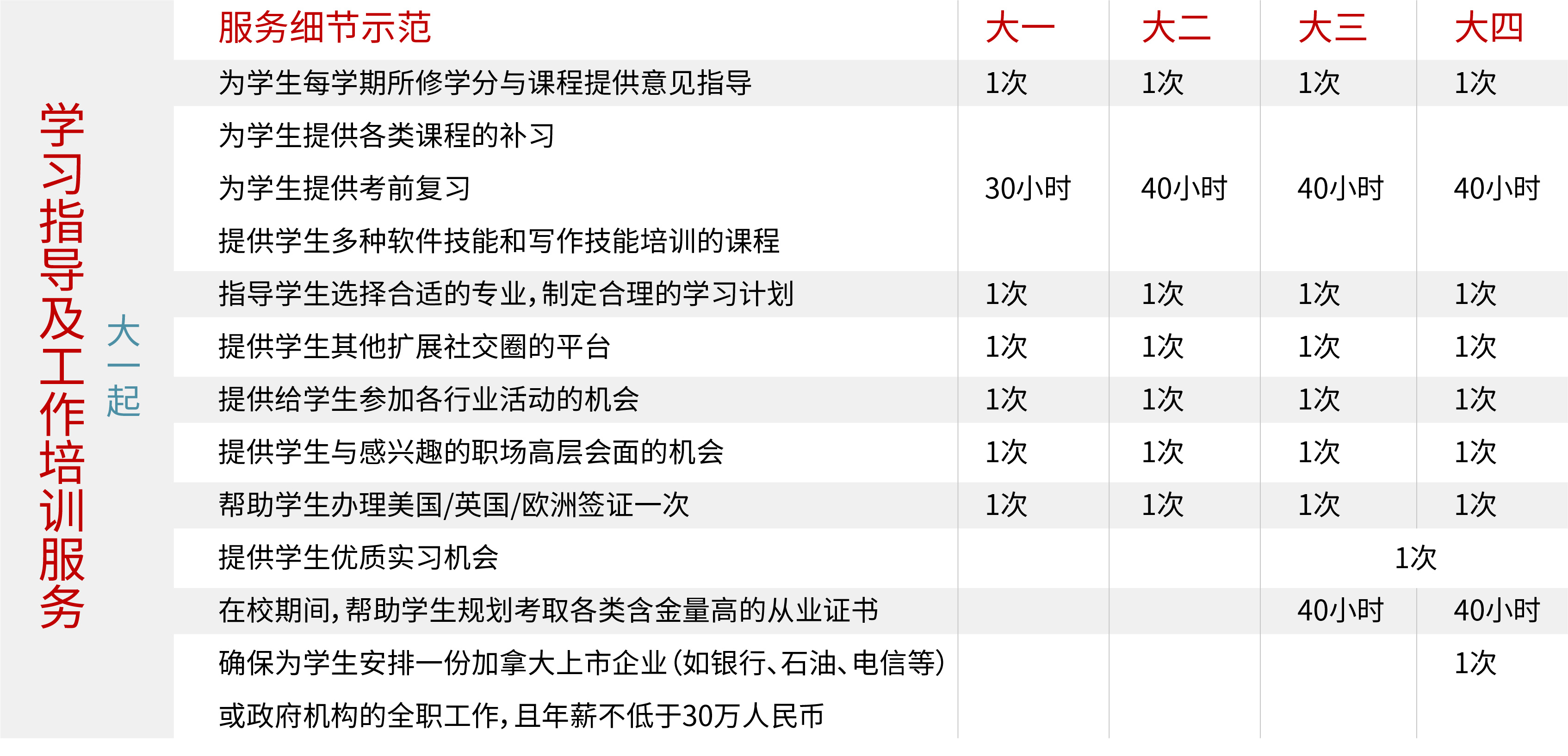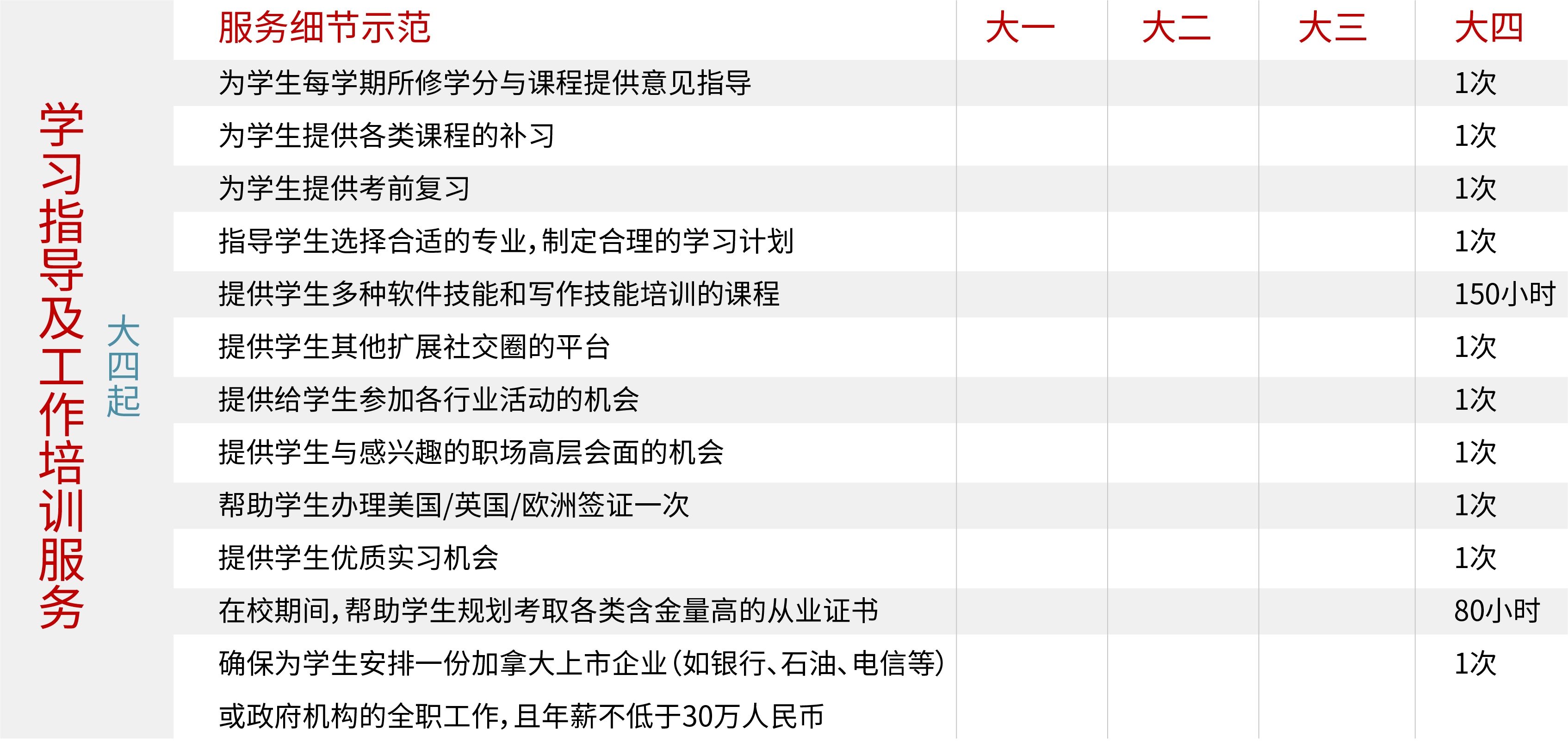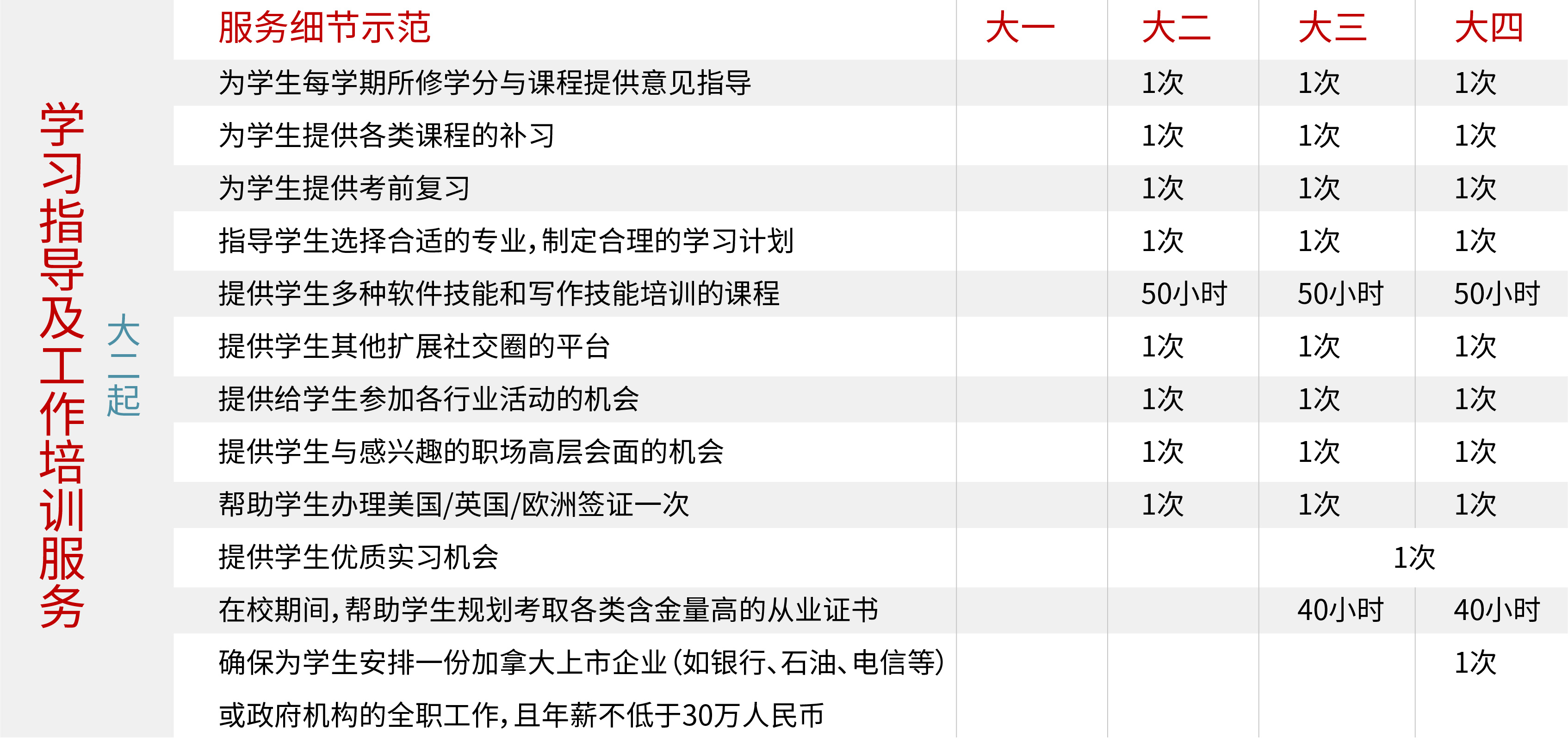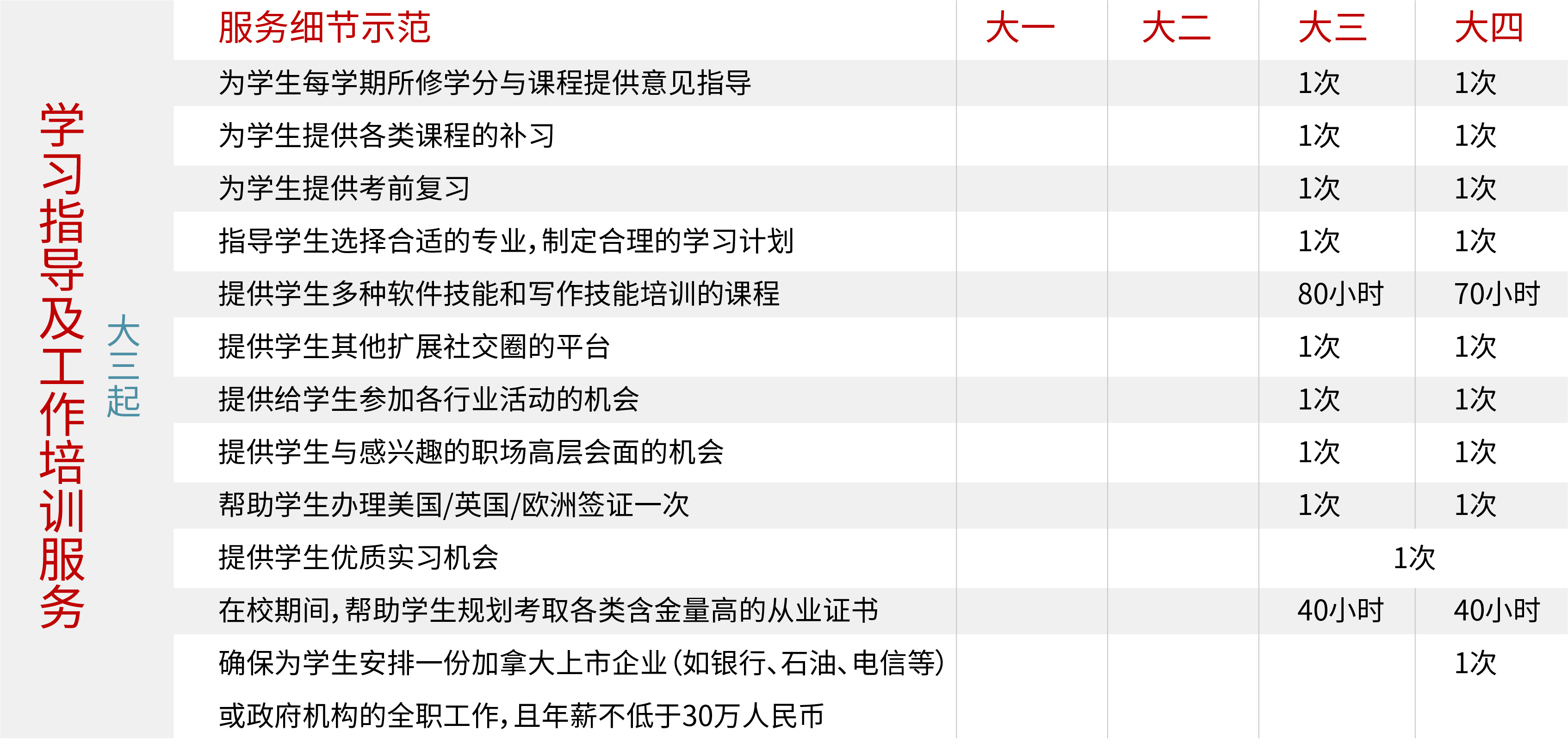 面向大学生、研究生 ,提供全方位的能力培养, 帮助学生在完成学业的基础上,更获得高价值的职场技能培训和实习经验, 使学生成为满足加拿大职场需求的人才。