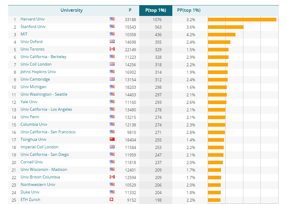 ** ▲Top 50 Universities in top 1% of most frequently cite publications** ▲**** **** CWTS莱顿大学排名基于世界各大高校的研究出版物及合作的影响,重点考量大学在科研方面的表现。该排名衡量了2014-17年间全球950多所主要大学的科学表现。
