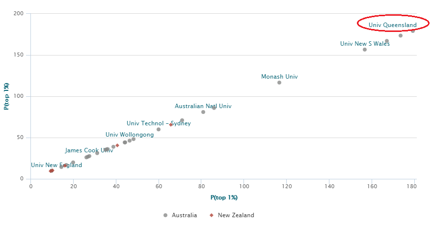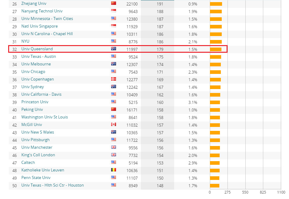 UQ在全球引用率最高1%的出版物排名中,贡献了179份出版物,这179篇被认为是大学研究人员和研究团队在119997篇公认期刊上发表的文献中的精华。这也意味着四年间, 昆士兰大学每个月在公开期刊上发表的文献都有250篇。 昆士兰大学在 生命和地球科学 的研究类别中再次成为澳大利亚排名最高的大学,世界排名第9位。按属于该领域发表的出版物数量前5%的大学计算。在 社会科学和人文领域 ,昆士兰大学亦是澳大利亚排名最高的大学,世界排名第34位。