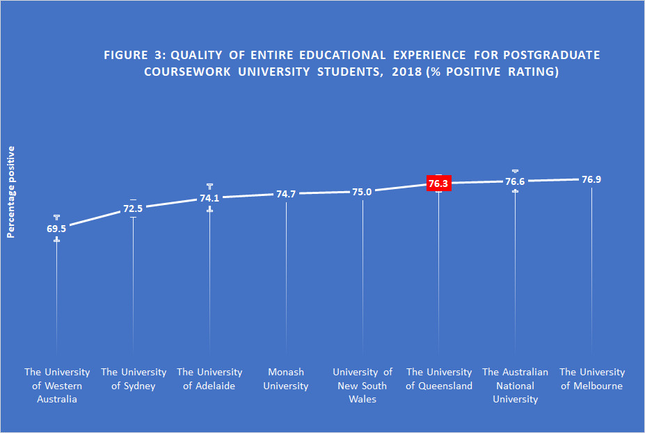 图表二:2017-2018年本科生总体教育体验 授课类研究生的部分,昆士兰大学亦有着出色的表现,以76.3%位列八校第三,和第一、二名的差距不到1%。