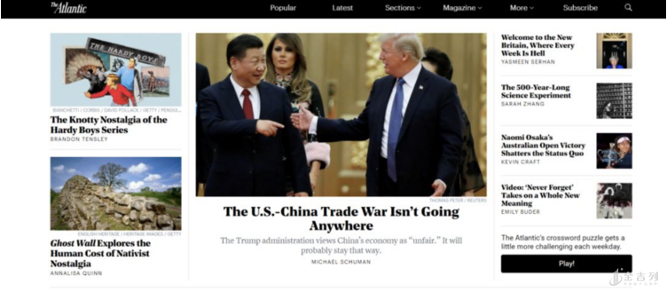 The Atlantic《大西洋月刊》创建于1857年,是美国一本以文学及文化评论为主的杂志,其受尊敬程度可与The New York Times 和 the Economist相媲美。 它的内容涵盖文学、政治、科学与艺术等方面,坚持无党派,倡导种族平等,无偏见原则,引领美国社会思潮长达160年之久,成为了美国乃至世界的重要媒体网站。 由于是杂志类型,每篇文章短小精悍,非常适合童鞋们日常积累用词和写作素材。另外,在”Sections” 栏目中还涉及了不同领域的子栏目,部分托福考试的内容相关,大家可以根据自己的兴趣选择性阅读。