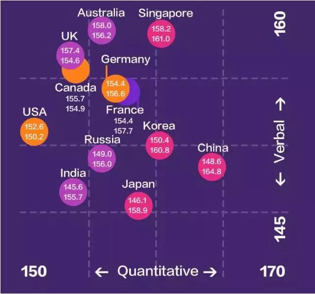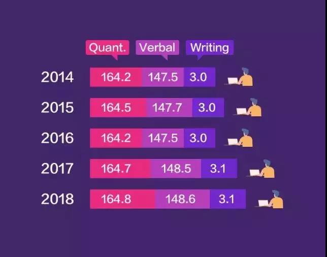2017-2018年度,全球考生的GRE平均分分别为: 语文150.5分,数学153.4分,写作3.6分
