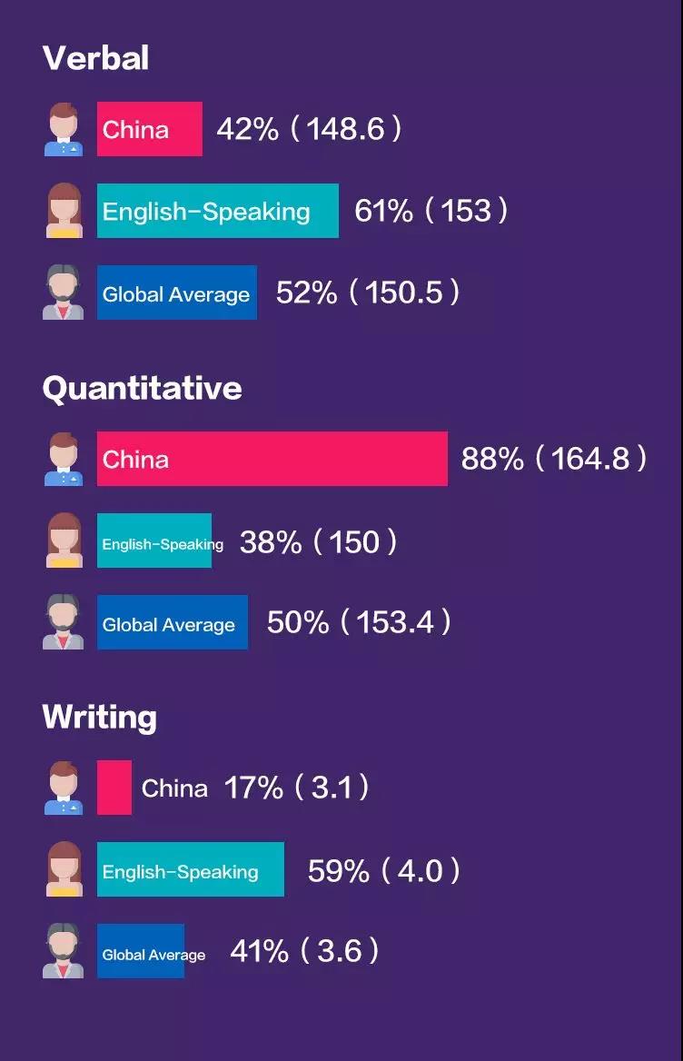 “Percentile”意味着考生达到这个分数超过了百分之多少的考生。 中国考生的数学平均分164.8 的percentile为88%,意味着 中国考生的数学平均分超过了全球88%的考生。显然是第一梯队的水平。 中国考生的语文和写作的表现逊色于世界平均水平, 语文平均分排名只超过了全球42%的的考生,写作平均分更是仅仅排名后17%。 这两方面的表现拉低了中国考生在研究生申请方面的竞争力。