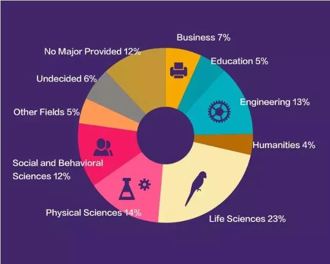 GRE考生申请专业方向分布如下: 工程专业:13% 理科专业:14% 生命科学:23% 社会科学:12% 人文学:4% 教育学:5% 商科:7%
