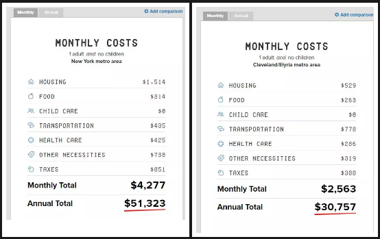 如果你选择了纽约,那么迎接你的将是 4277 美刀的月度花销。如果你选择了凯斯西储大学所在的克利夫兰,那么一个月 2500+ 美刀就够用了。