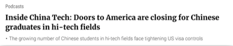 香港《南华早报》近日报道, 高科技专业的中国学生进入美国的大门正在关闭。