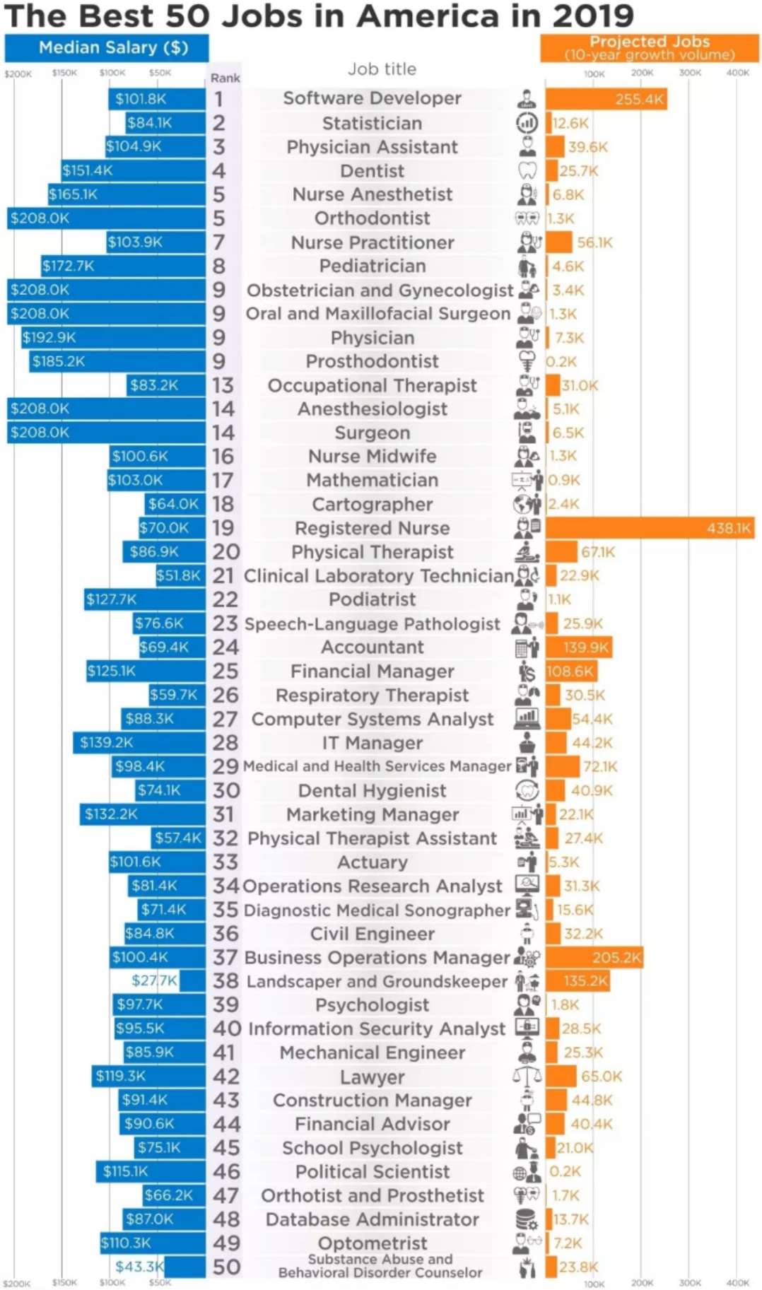 2019年最佳工作TOP50根据工资中位数来看(蓝色图表):